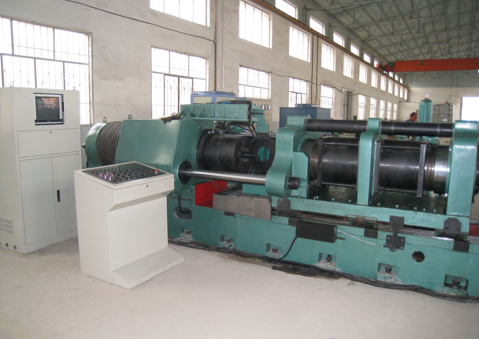 ● 主軸箱采用兩個單列圓柱滾子軸承的結構方式,具有旋轉精度高的優點,同時在主軸箱中設置兩個推力調心滾子軸承, 一個采用固定安裝方式,另一個采用平衡油缸活動安裝的獨特結構方式,來平均承載摩擦與頂鍛的軸向力,使用壽命提高數倍。